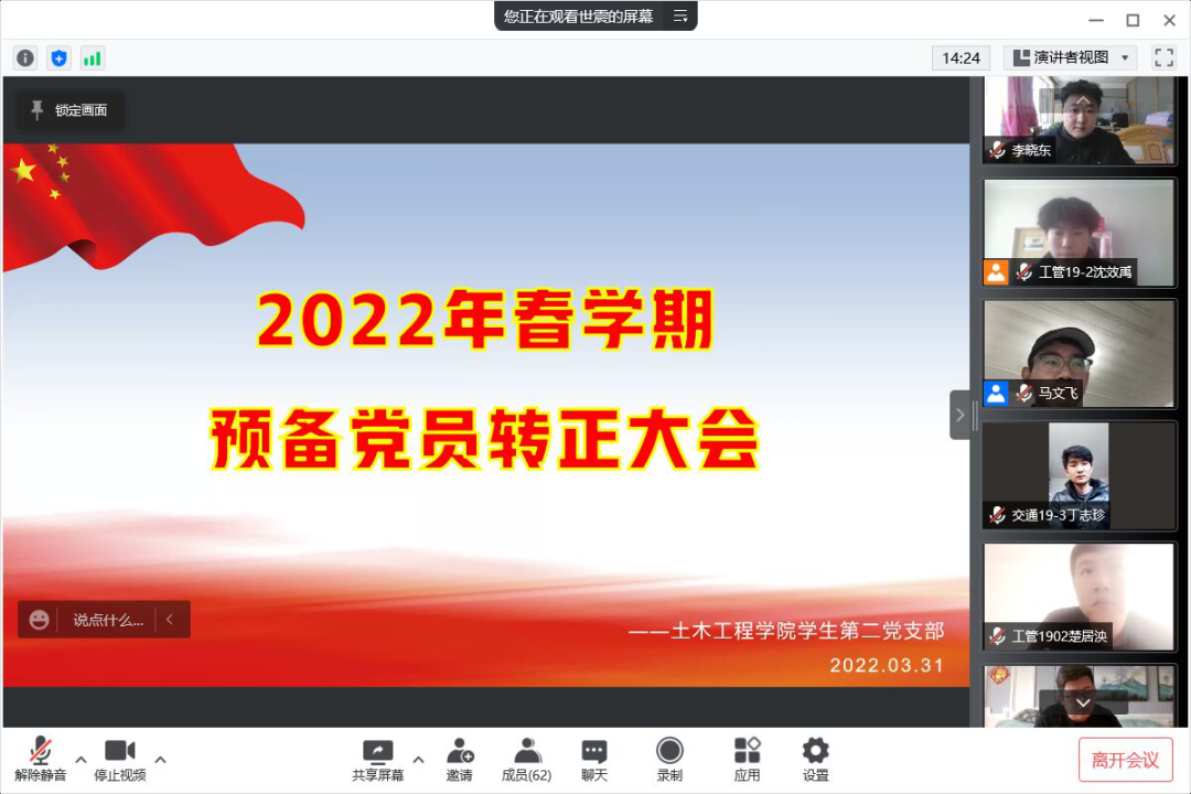 2022年3月31日14:30,太阳集团tyc9728学生第二党支部通过腾讯会议组织开展了预备党员转正大会,参加本次会议的有支部书记杨明明老师、全体党员及部分积极分子,本次会议由党员荣颖蕤同志主持。