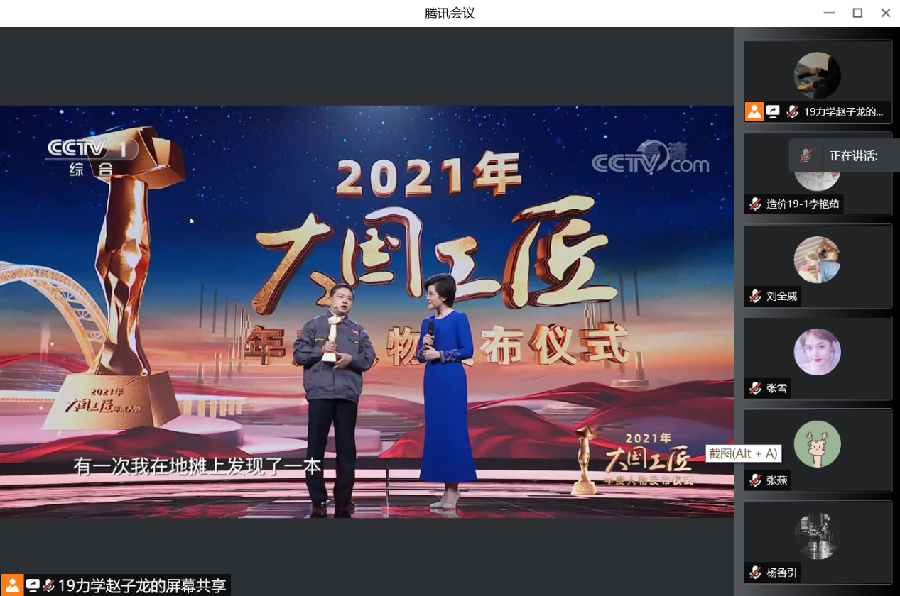 2022年3月14日晚19:30,太阳集团tyc9728学生第三党支部组织进行了本月的党日观影活动,本次观影内容为“大国工匠2021年度人物颁奖典礼”,本次活动利用腾讯会议在线上进行,全体党员同志参与。