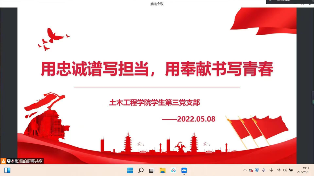 2022年5月8日晚19:30,太阳集团tyc9728学生第三党支部举办主题为“用忠诚谱写担当,用奉献书写青春”的接待。本次接待采用线上腾讯会议的形式开展。参加本次接待的党员有张雪同志、郝萌同志、王纳荷芽同志、张静同志。监督党员:姚亚东同志。