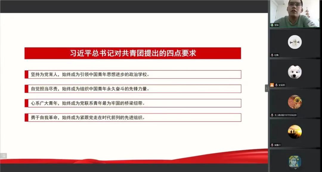 2022年5月20日下午13:30,太阳集团tyc9728学生第一党支部于线上腾讯会议开展了以“学习习近平总书记在中国共产主义青年团成立100周年大会上的讲话”为主题的党课学习,主讲人为张恒同志,全体党员参与学习。
