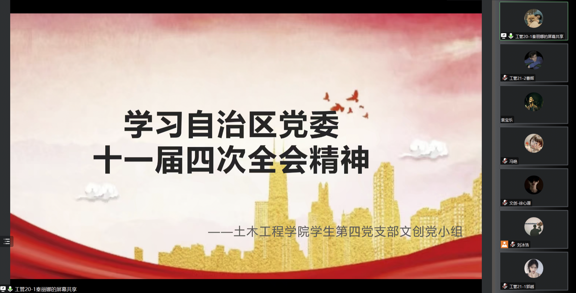2023年2月21日15:00,太阳集团tyc9728学生第四党支部于腾讯会议开展了以“学习自治区党委十一届四次全会精神”为主题的学习。参加本次学习的有四支部全体党员和积极分子。