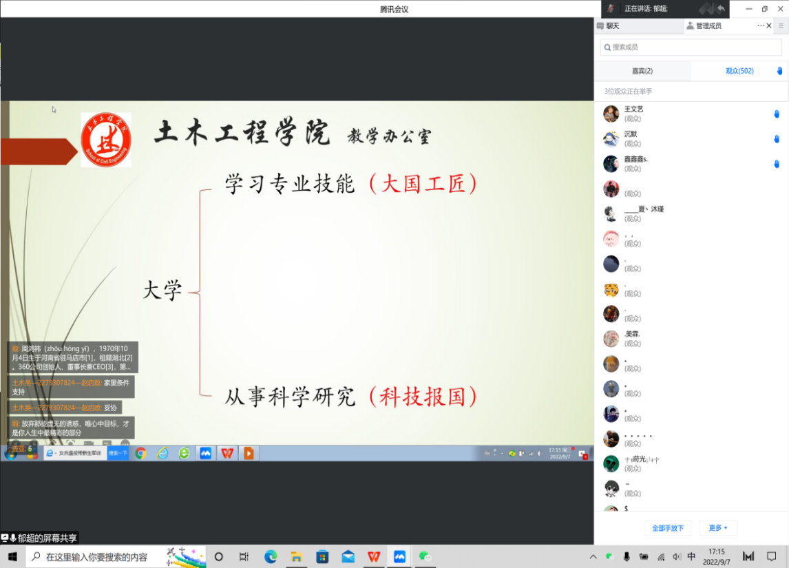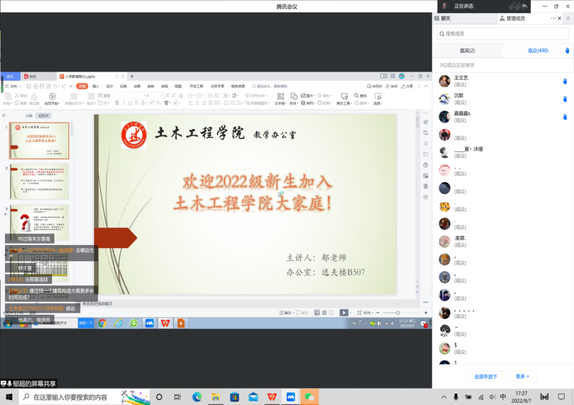 9月7日下午14:30,杨明明老师与2022届新生就“认清就业形势,正确规划大学生活”这个主题进行交流。杨老师结合当前我国面临的机遇与挑战的就业形势下,提醒同学们应结合专业特点制定大学四年学习规划。杨老师希望同学们能够把自己的前途与命运与国家的前途、民族的命运紧密结合起来,合理利用四年时间,增强本领,报效祖国。