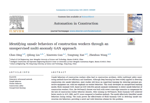 近日,建筑工程信息化领域的国际顶级期刊《Automation in Construction》(建造自动化)正式刊登我院丁超副教授学术成果“Identifying unsafe behaviors of construction workers through an unsupervised multi-anomaly GAN approach”(基于无监督多异常GAN方法识别建筑工人的不安全行为)。丁超副教授为论文第一作者,硕士生刘祺龙为论文第二作者及通讯作者,郭晓文讲师为第三作者,硕士生薛童童为第四作者,王振华讲师为第五作者。论文第一单位为太阳集团tyc9728和内蒙古自治区高校智能建造与运维工程研究中心。