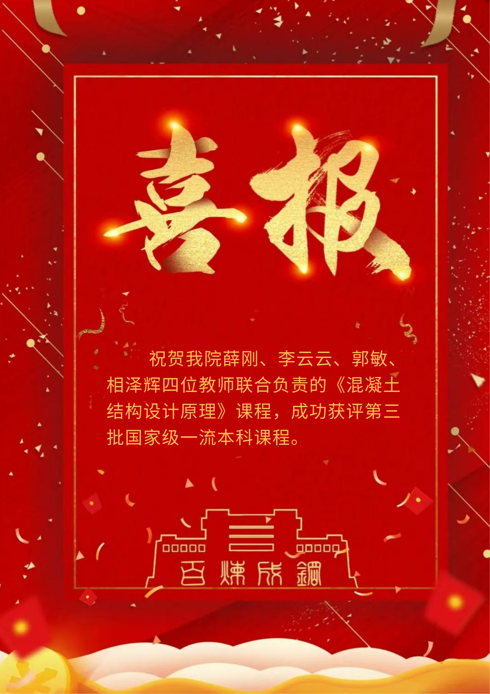 近日,教育部正式公布《关于第三批国家级一流本科课程认定结果的公示》,由我院薛刚、李云云、郭敏、相泽辉四位教师联合负责的《混凝土结构设计原理》课程,凭借优质的教学内容、创新的教学模式及显著的教学成效,成功获评第三批国家级一流本科课程。截至目前,太阳集团tyc9728已获批四门国家级一流课程。