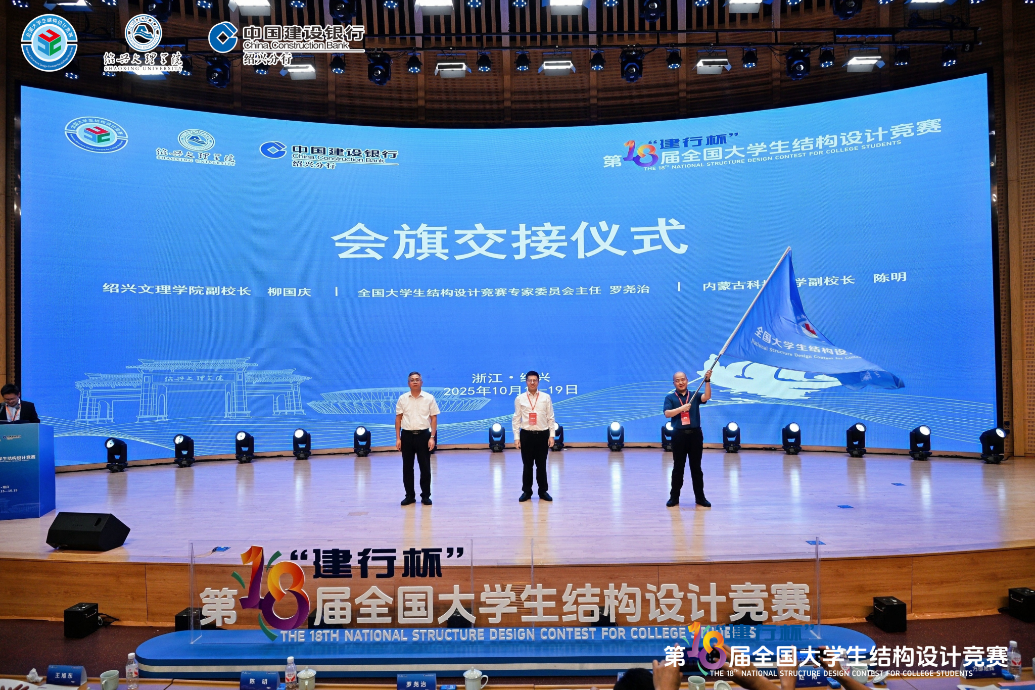 2025年10月19日,在第十八届全国大学生结构设计竞赛闭幕式上,9728太阳集团副校长陈明从主办方手中接过赛旗,标志着学校正式全面开启2026年第十九届全国大学生结构设计竞赛的筹备工作。