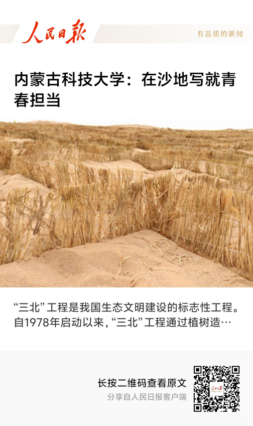 近日,《人民日报》对学院“金山银漠·绿色密码”实践团在锡林郭勒盟苏尼特左旗巴彦淖尔镇浑善达克沙地开展的生态志愿服务行动进行报道。