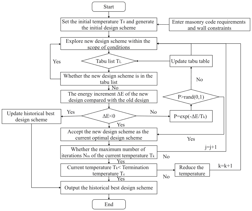 为解决砌体填充墙自动优化布局上的协同优化的问题,作者将优化砌体布局视为具有离散决策变量和有限搜索空间的组合优化问题。该优化问题涉及将砌体布局的边界约束作为约束处理,并将设计方案作为一组决策变量来考虑。作者的目标是确定一组决策变量,产生更高的砌体质量或更少的材料浪费,并运用模拟退火与禁忌搜索相结合的BIM砌体平面布置优化方法(SA-TS)建立相应的数学模型,将砌体布局问题转化为数学问题,然后与Dynamo和Revit交互以获取墙的初始数据。其次,基于墙体的初始数据,应用SA-TS方法对砌体布置方案进行优化。最后,在优化后的砌体布局方案的基础上,采用参数化方法完成了二级结构的创建和砌体模型的布局。