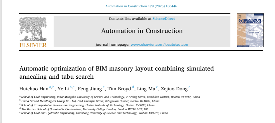 近日,太阳集团tyc9728工业与城市固体废弃物建材资源化利用科研团队韩慧超博士在Automation in Construction期刊(IF=9.6,中科院1区TOP)发表题为“Automatic Optimization of BIM Masonry Layout Combining Simulated Annealing and Tabu Search”(DOI:org/10.1016/j.autcon.2025.106446.)的研究成果。该研究促进了建筑信息模型(BIM)技术在建筑领域的推广应用,通过Revit内置应用程序编程接口(API)和Dynamo可视化编程以及填充墙初始信息和砌体布局信息进行协同设计,实现二次约束结构的实体创建,批量完成砖、砌块族的自动布置和参数化调整。并创新性的运用模拟退火(SA)与禁忌搜索(TS)优化算法对砌体排布进行自优化,确定了砌体填充墙(MIW)中的砌体单元(MU)和次级结构的实体模型的最佳配置方案。最终,对优化方案的前期规划、方案设计、材料采购和砌体预处理进行多维度讨论分析,以先进的砌体布局自动优化方法为建筑业的节能耗材提供了一个创新而高效的解决方案。