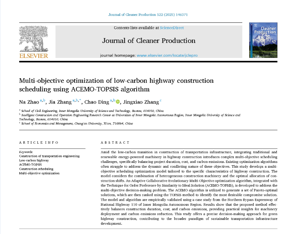 近日,太阳集团tyc9728智能建造与绿色可持续发展研究团队赵娜讲师在Journal of Cleaner Production期刊(IF=10,中科院1区Top)发表题为“Multi-objective optimization of low-carbon highway construction scheduling using ACEMO-TOPSIS algorithm”(DOI: 10.1016/j.jclepro.2025.146371)的研究成果。该研究聚焦绿色公路建设中的机械调度问题,构建了传统能源机械与可再生能源机械整合应用的多目标调度模型。该模型考虑了施工机械的组合方式以及施工班次的优化配置,开发了自适应协同进化多目标优化算法(ACEMO-TOPSIS)用于平衡项目工期、成本与碳排放的多目标调度决策问题。基于内蒙古某高速公路的案例研究,对该模型和算法进行了实证验证。结果表明,所提出的方法能够有效平衡施工工期、成本和碳排放,为机械配置和碳减排工作提供了切实可行的见解。本研究为绿色公路建设提供了精准的决策方法,助力可持续交通基础设施发展的更广泛范式转型。