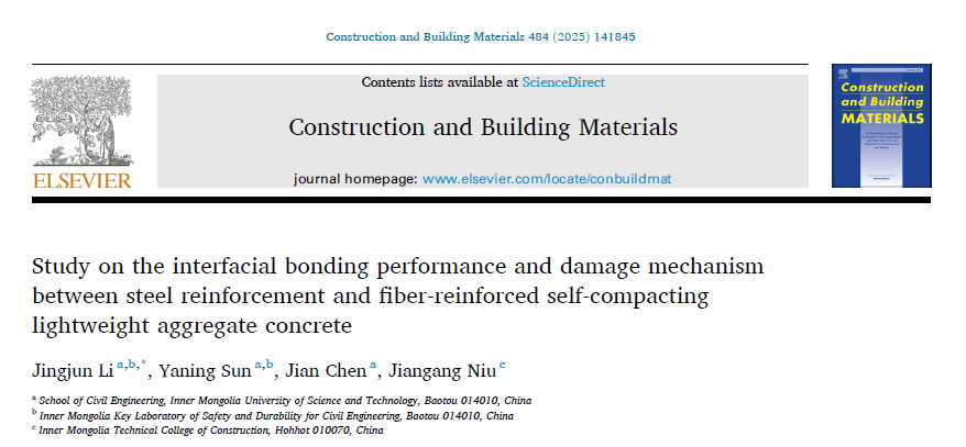 近日,太阳集团tyc9728工业与城市固体废弃物建材资源化利用团队李京军教授在Construction and Building Materials期刊(IF=8.0,中科院1TOP)发表题为“Study on the interfacial bonding performance and damage mechanism between steel reinforcement and fiber-reinforced self-compacting lightweight aggregate concrete”(DOI: 10.1016/j.conbuildmat.2025.141845)的研究成果。该研究系统探究了纤维增强自密实轻骨料混凝土与钢筋的界面粘结性能与损伤机理,通过11组中心拔出试验分析了强度等级、纤维掺量与钢筋直径对粘结滑移行为的影响,结合有限元模拟揭示了损伤机制,建立了极限粘结强度计算公式与粘结-滑移本构模型,并验证了纤维桥联效应对抑制裂缝扩展的关键作用。