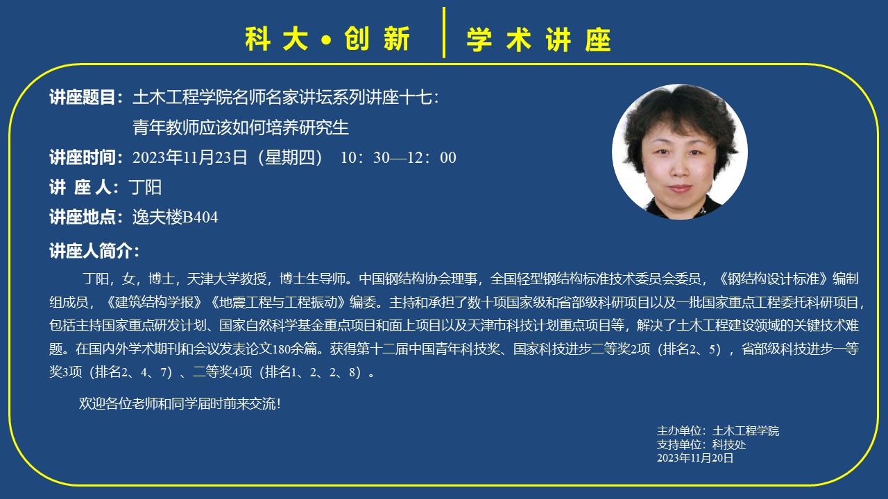 丁阳,女,博士,天津大学教授,博士生导师。中国钢结构协会理事,全国轻型钢结构标准技术委员会委员,《钢结构设计标准》编制组成员,《建筑结构学报》《地震工程与工程振动》编委。主持和承担了数十项国家级和省部级科研项目以及一批国家重点工程委托科研项目,包括主持国家重点研发计划、国家自然科学基金重点项目和面上项目以及天津市科技计划重点项目等,解决了土木工程建设领域的关键技术难题。在国内外学术期刊和会议发表论文180余篇。获得第十二届中国青年科技奖、国家科技进步二等奖2项(排名25),省部级科技进步一等奖3项(排名247)、二等奖4项(排名1228)。