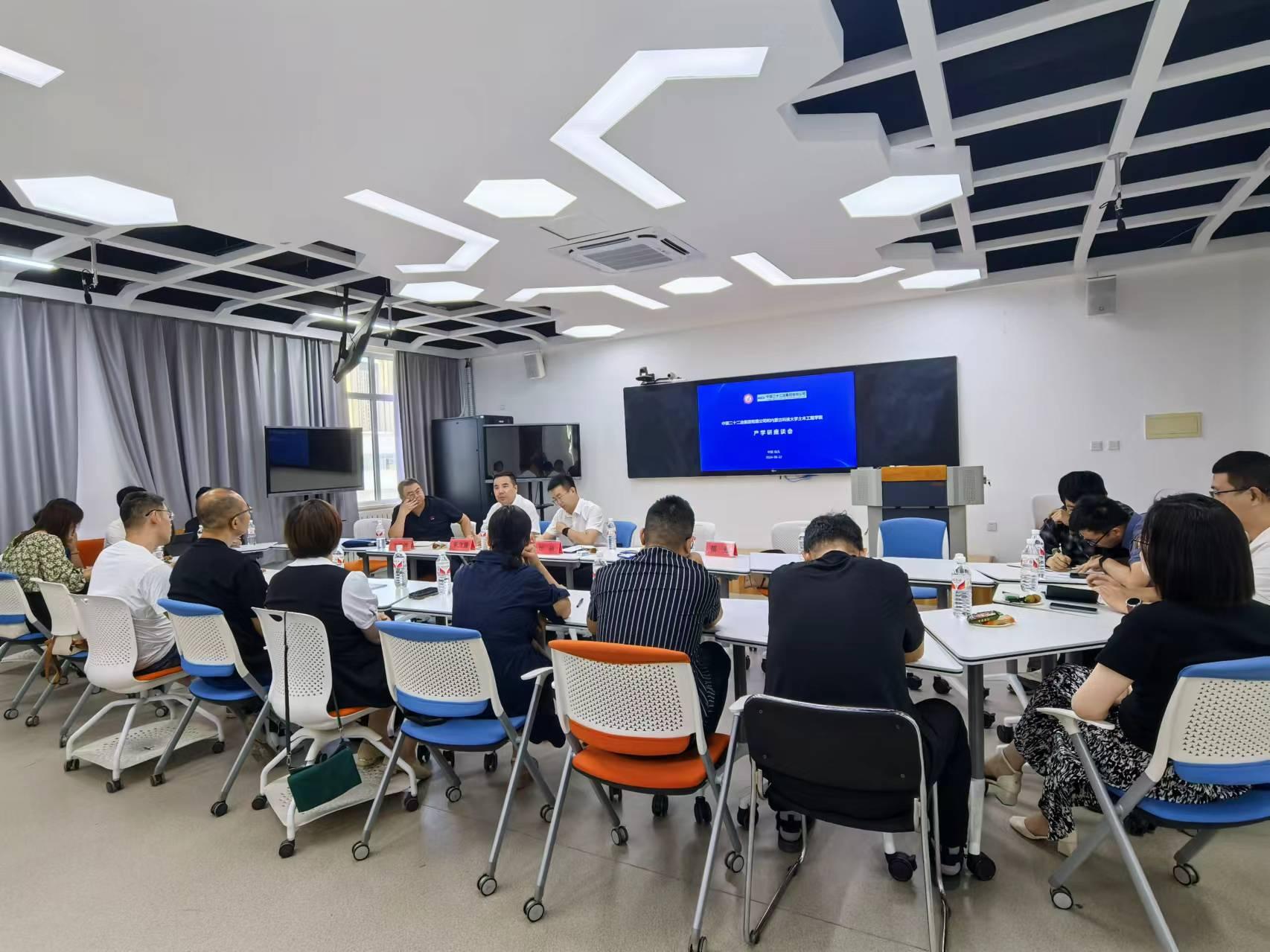 座谈会上刘硕首先介绍了二十二冶的基本情况,张利敏书记介绍了太阳集团tyc9728的基本情况和科研开展情况。随后朱立雷介绍了二十二冶集团与高校合作开展科研的情况,并详细解说了各类项目申报注意事项。之后各系主任和项目申报人就与二十二冶集团开展产学研合作事宜进行了深度沟通和交流。