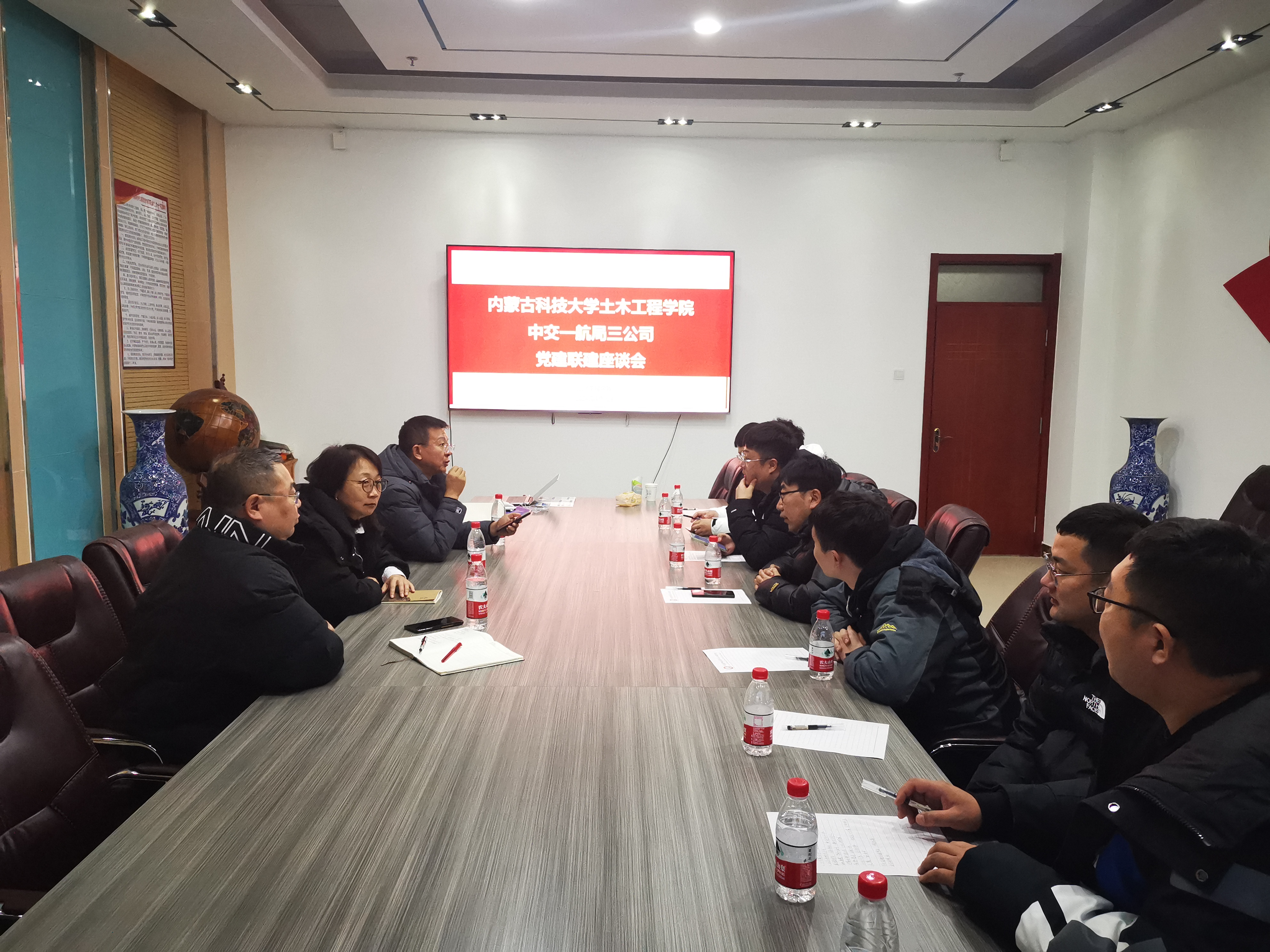 202413日下午14:30,太阳集团tyc9728与中交一航局三公司包头项目部举行校企交流活动积极探索党建引力的校企可持续合作模式,助力产教融合快速发展。学院党委书记张利敏、副院长王英浩等8人,中交一航局三公司包头项目部书记贺洪刚一行7人参加交流活动。