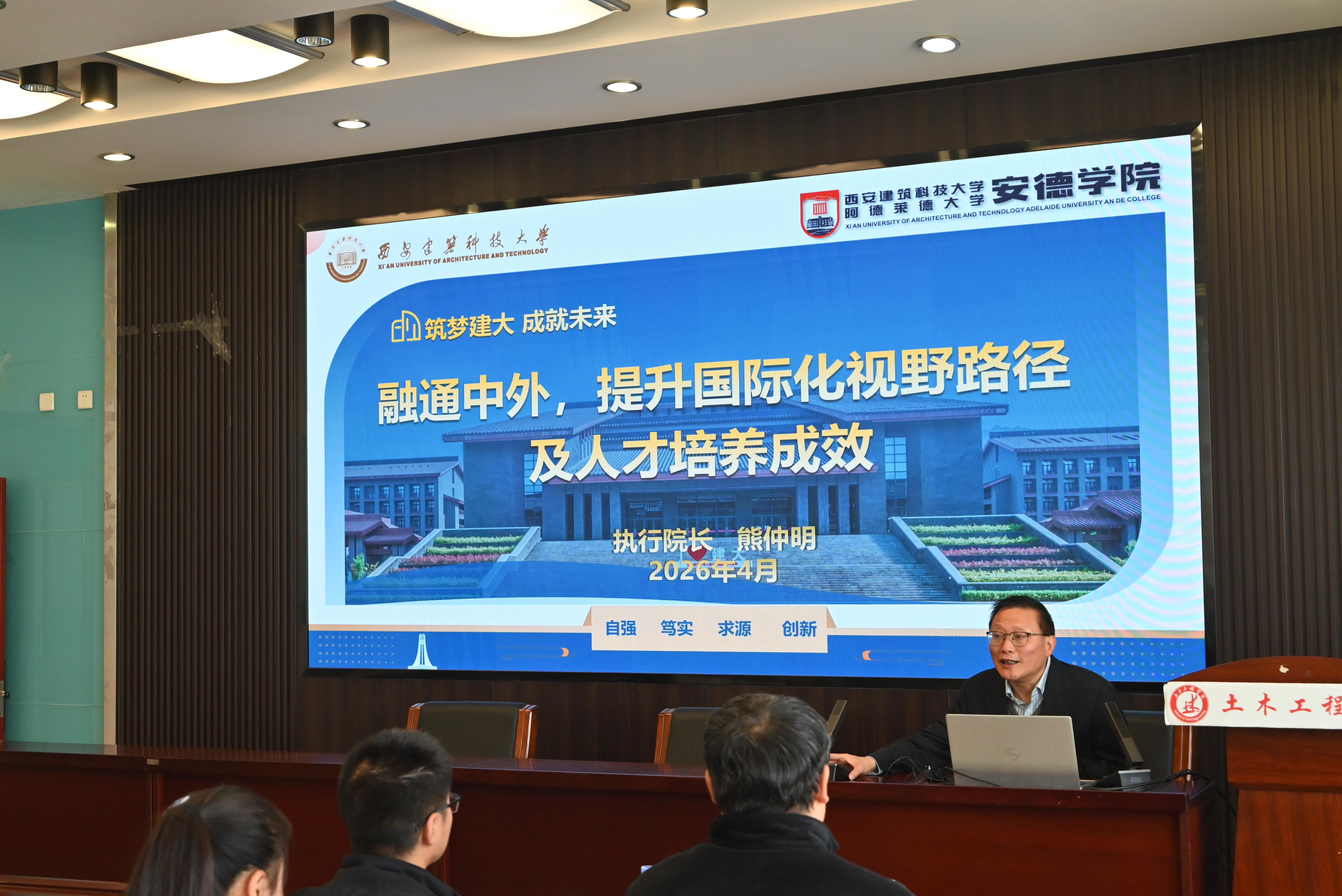 座谈开始前,熊仲明院长在逸夫楼B404作了题为《中外合作办学机构本科国际化人才培养体系的构建与实践—以安德学院为例》的学术讲座。作为结构工程领域的知名专家、教育部和陕西省中外合作办学评审专家,熊仲明院长结合自身丰富的办学管理经验与科研实践,向学院师生详细介绍了西安建筑科技大学安得学院的人才培养体系、国际合作交流模式、课程设置特色及实践教学成果,使学院师生了解了国际化办学前沿理念。