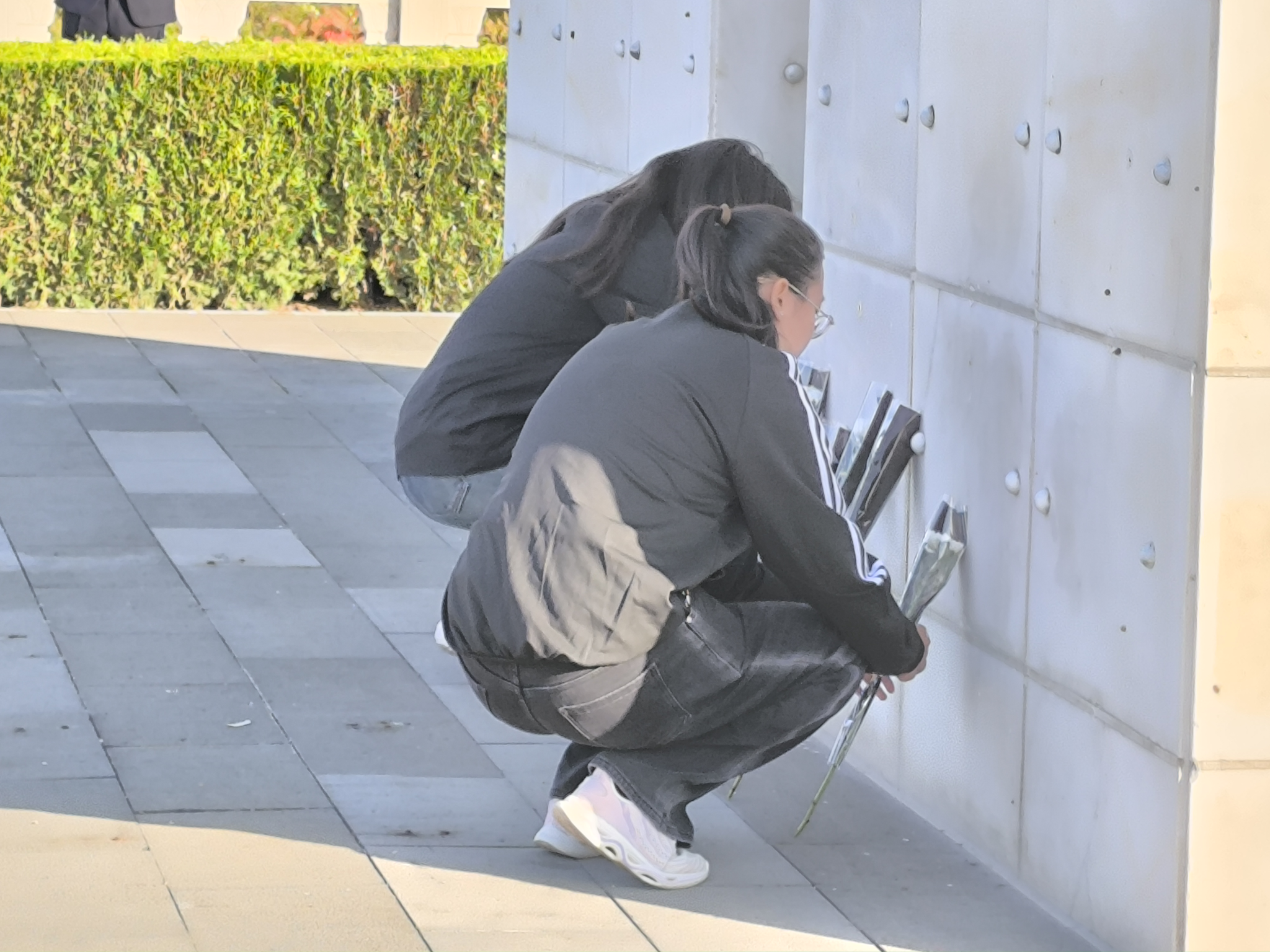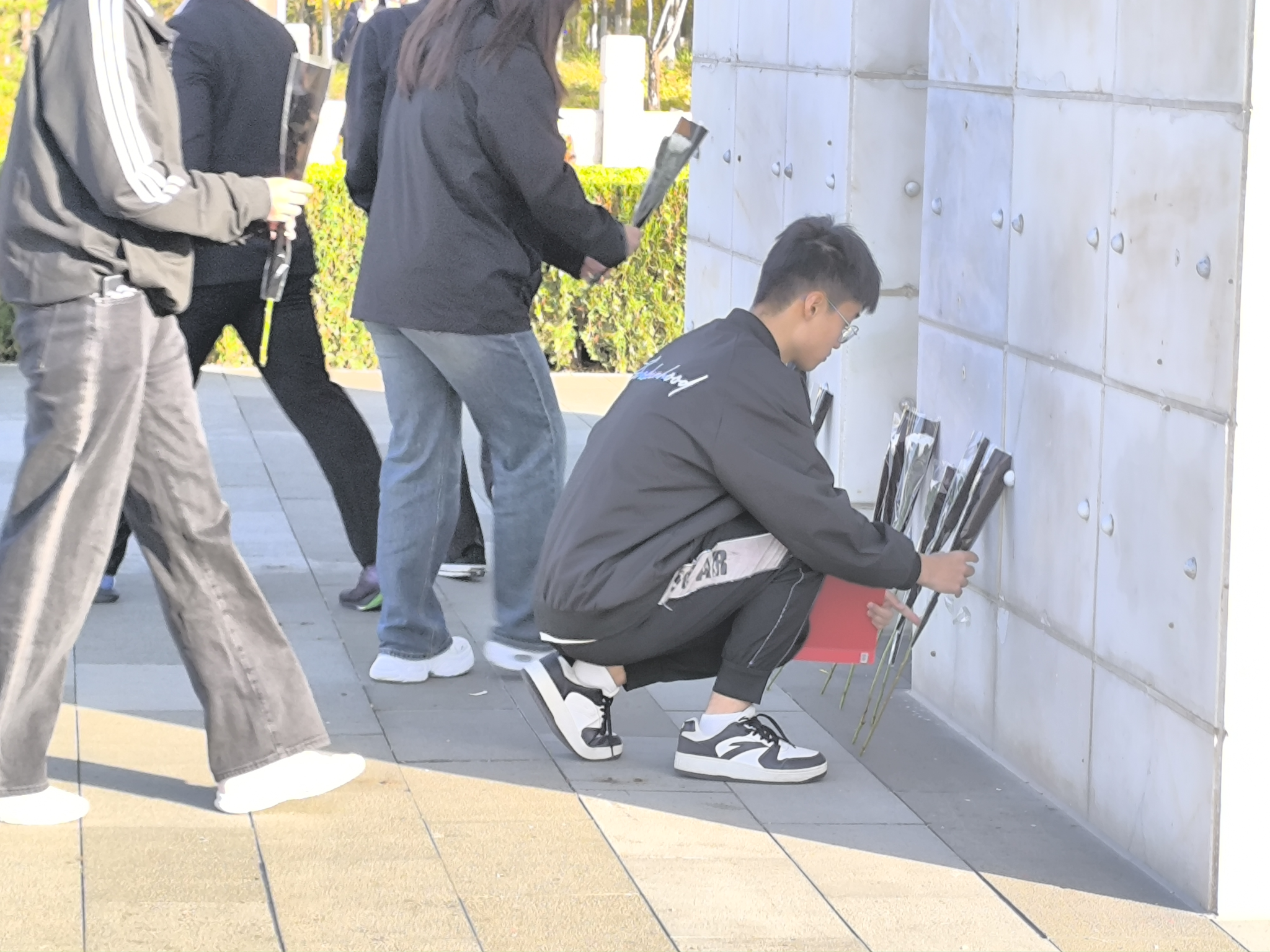 默哀结束后,青马学员依次缓步走向纪念碑,将手中的白色鲜花轻轻放在碑前。洁白的花朵象征着英烈精神的纯粹与不朽,每一次俯身敬献,都是青年一代对先烈“为有牺牲多壮志”的深切缅怀;每一束鲜花寄托,都饱含着“接过时代接力棒”的坚定决心,无声诉说着“先烈未竟志,吾辈当践行”的青春承诺。