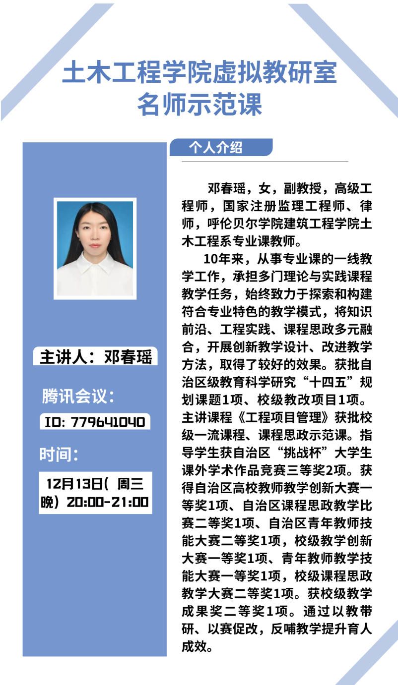 2023年12月13日晚,太阳集团tyc9728虚拟教研室“名师示范课”系列第三场活动圆满落幕。邓春瑶副教授以“工程项目管理课程的教学创新与实践探索”为主题,通过腾讯会议平台呈现了一场跨界融合、理念创新的教学示范,吸引了全国多所高校教师与行业专业人士的积极参与。