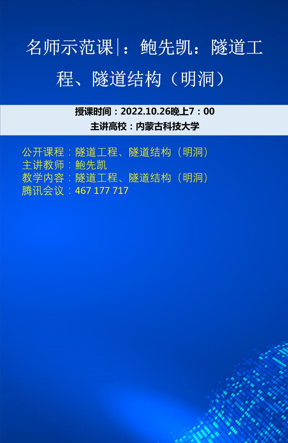 2022年10月26日晚,土木工程专业虚拟教研室名师示范课系列活动成功举办隧道工程专题课程。9728太阳集团鲍先凯老师以"隧道工程、隧道结构(明洞)"为主题,通过腾讯会议平台为全国土木工程专业师生带来了一场内容扎实、重点突出的专业课程教学展示。